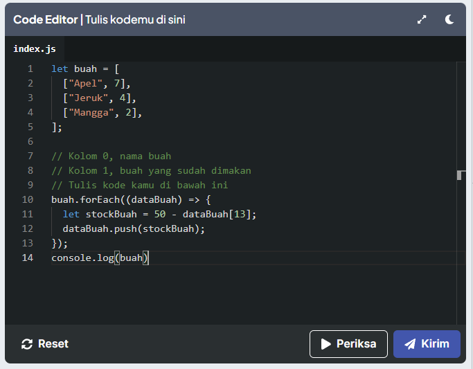 Kamu lagi kerjakan soal yang mana ya? Kalau kita lihat kode di gambar, ada kesalahan teknis yang bikin kodenya nggak karena kamu menulis dataBuah[13]. Padahal, isi di dalam array buah itu cuma ada dua data (nama buah di index 0 dan jumlah di index 1). Index ke-13 itu kosong, jadi hasilnya bakal NaN (bukan angka).